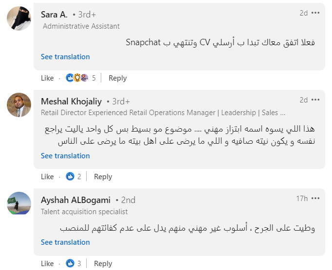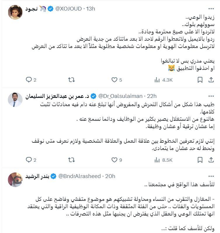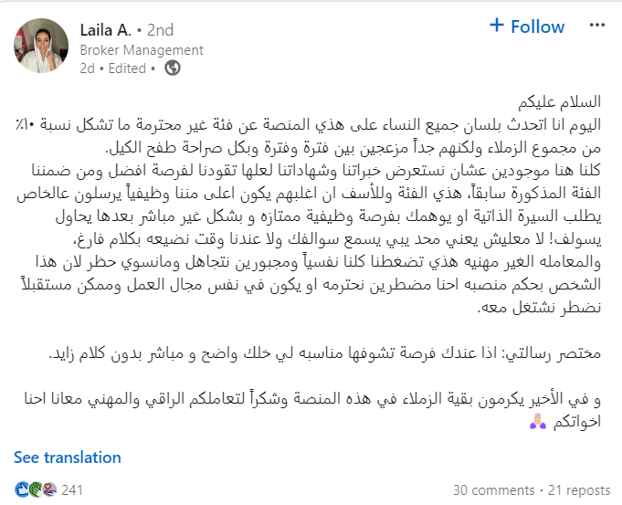"السلام عليكم.. اليوم انا اتحدث بلسان جميع النساء على هذي المنصة عن فئة غير محترمة ما تشكل نسبة ١٠٪ من مجموع الزملاء ولكنهم جداً مزعجين بين فترة وفترة وبكل صراحة طفح الكيل. كلنا هنا موجودين عشان نستعرض خبراتنا وشهاداتنا لعلها تقودنا لفرصة افضل ومن ضمننا الفئة المذكورة سابقاً، هذي الفئة وللأسف أن اغلبهم يكون أعلى مننا وظيفياً يرسلون عالخاص يطلب السيرة الذاتية أو يوهمك بفرصة وظيفية ممتازه وبشكل غير مباشر بعدها يحاول يسولف! لا معليش يعني محد يبي يسمع سوالفك ولا عندنا وقت نضيعه بكلام فارغ، والمعاملة الغير مهنيه هذي تضغطنا كلنا نفسياً ومجبورين نتجاهل ومانسوي حظر لان هذا الشخص بحكم منصبه احنا مضطرين نحترمه او يكون في نفس مجال العمل وممكن مستقبلاً نضطر نشتغل معه".