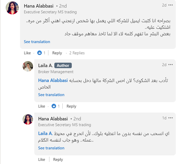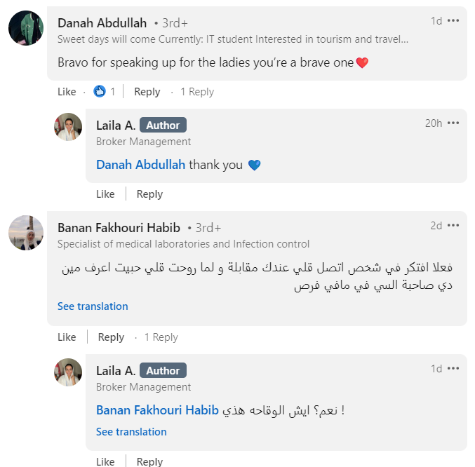 واختتمت منشورها بالقول: "مختصر رسالتي: إذا عندك فرصة تشوفها مناسبه لي خلك واضح و مباشر بدون كلام زايد… وفي الأخير يكرمون بقية الزملاء في هذه المنصة وشكراً لتعاملكم الراقي والمهني معانا إحنا أخواتكم".