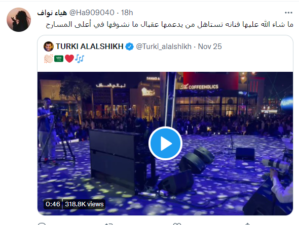 وحظي الفيديو بعشرات آلاف المشاهدات والإعجابات عبر موقع "تويتر" حيث تم تداوله بشكل واسع ومنهم رئيس هيئة الترفيه تركي آل الشيخ.