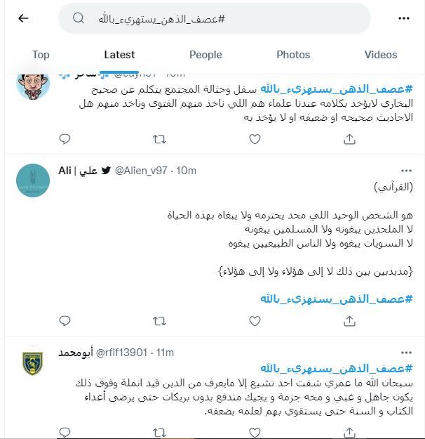 تصدر وسم "#عصف_الذهن_يستهزيء_بالله " قائمة الأكثر تغريدًا على موقع التدوين "تويتر" في المملكة العربية السعودية خلال الساعات الماضية بعد انتشار مقطع فيديو لشخص يتطاول على الذات الإلهية ويمس بالقيم الدينية.