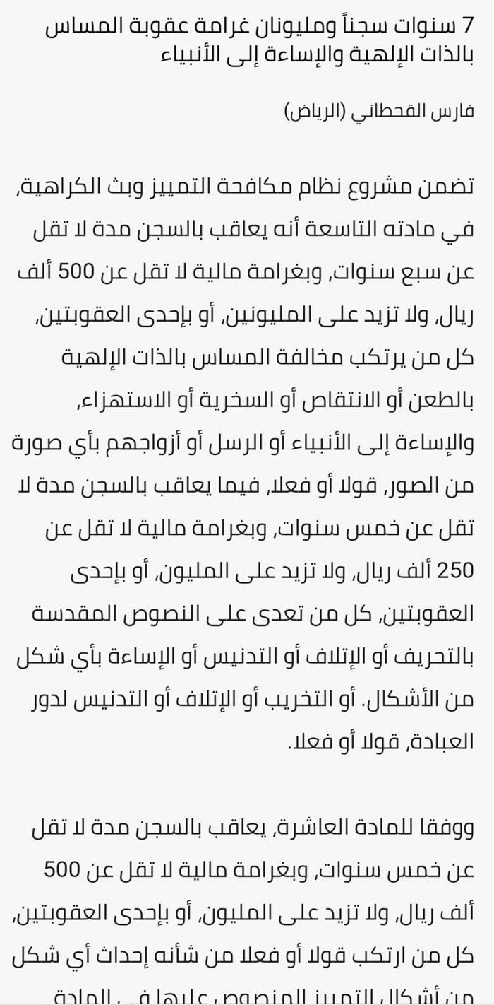فيما يعاقب بالسجن مدة لا تقل عن خمس سنوات، وبغرامة مالية لا تقل عن 250 ألف ريال، ولا تزيد على المليون، أو بإحدى العقوبتين، كل من تعدى على النصوص المقدسة بالتحريف أو الإتلاف أو التدنيس أو الإساءة بأي شكل من الأشكال أو التخريب أو الإتلاف أو التدنيس لدور العبادة، قولًا أو فعلًا.