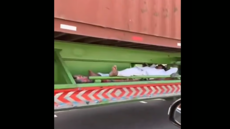 وأظهر الفيديو، الذي صوّره أحد السائقين، ممن تزامن مروره بالقرب من الشاحنة المُسرعة، الرجل النائم في مكانٍ قريب جدًا من عجلات الشاحنة ضخمة، دون أدنى حماية لحياته.