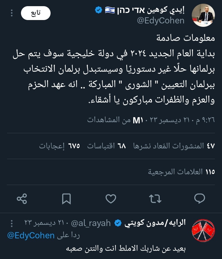 وأظهرت التغريدة المتداولة أن كوهين كتب قبل أشهر تحت عنوان "معلومات صادمة": “بداية العام الجيد 2024 في دولة خليجية سوف يتم حل برلمانها حلًا غير دستوريًا وسيستبدل برلمان الانتخاب ببرلمان التعيين "الشورى" المباركة.. انه عهد الحزم والعزم والظفرات مباركون يا أشقاء".