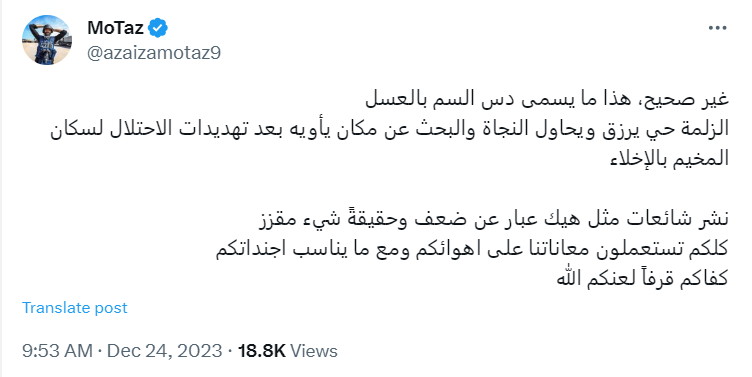 وكتب عزايزة في رده على الإشاعة قائلًا: “غير صحيح، هذا ما يسمى دس السم بالعسل الزلمة حي يرزق ويحاول النجاة والبحث عن مكان يأويه بعد تهديدات الاحتلال لسكان المخيم بالإخلاء نشر شائعات مثل هيك عبار عن ضعف وحقيقةً شيء مقزز كلكم تستعملون معاناتنا على اهوائكم ومع ما يناسب اجنداتكم كفاكم قرفاً لعنكم الله".
