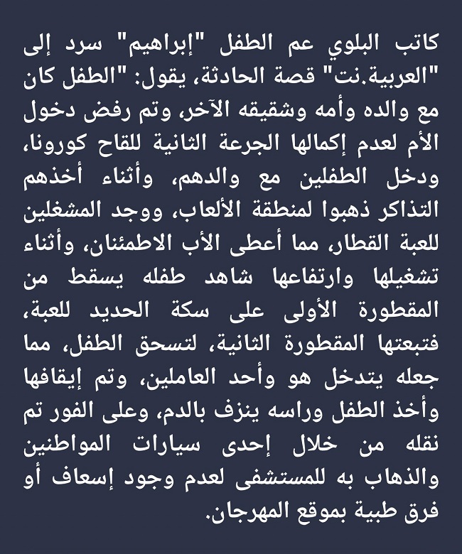 في حين قال كاتب البلوي عم الطفل إبراهيم: "كان الطفل مع والده وأمه وشقيقه الآخر، وتم رفض دخول الأم لعدم إكمالها الجرعة الثانية للقاح كورونا، ودخل الطفلين مع والدهما، وأثناء أخذهم التذاكر ذهبوا لمنطقة الألعاب، ووجد المشغلين للعبة القطار، مما أعطى الأب الاطمئنان”.