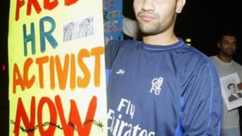 ناشط حقوقي بحريني يحمل لافتة تطالب باطلاق سراح زميل له تعتقله السلطات