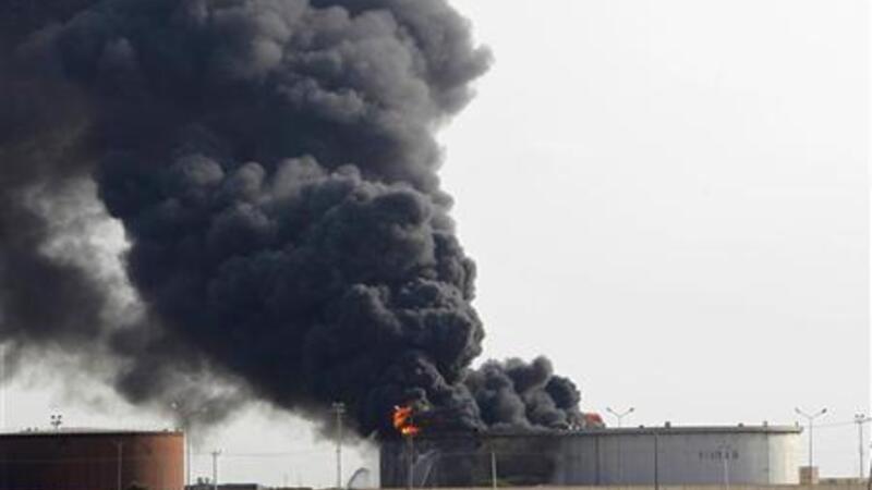 عانت مدينة مصراتة التي يسيطر عليها المعارضون المسلحون من نقص الوقود الاثنين اذ احتدم حريق في مستودع أصابه صاروخ أطلقته قوات الحكومة الليبية.