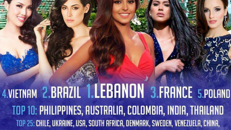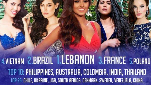 وفي تصويت الموقع جاءت البرازيلية في المرتبة الثانية والفرنسية في الثانية، والفييتنام في المركز الرابع وبولندا في الخامس، الا انه ووفق النتيجة النهائية للمسابقة تبيّن ان اللبنانية هي الوحيدة التي نجح الرهان في وصولها الى مرتبة بين المراتب الخمسة الاولى.