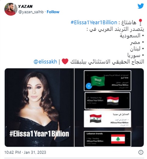 وأطلق جمهور النجمة ومتابعوها هاشتاق بعنوان #Elissa1Year1Billion ، تصدر التريند في أغلب الدول العربية ليُضيف نجاحاً جديداً وتاريخياً في مسيرة إحدى أبرز النجمات على الساحة الغنائية العربية، لتصبح أول مطربة عربية تحقق هذا الإنجاز غير المسبوق في عالم الموسيقى في العالم العربي.