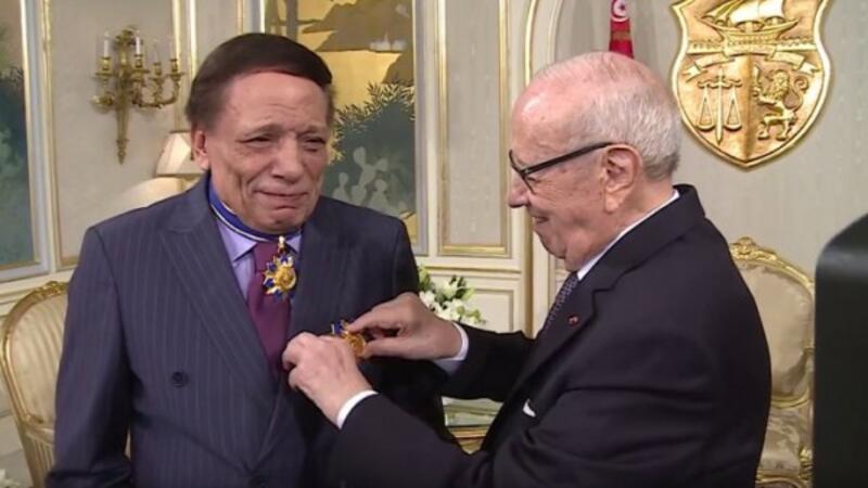 وجاء في بيان لوزارة الشؤون الثقافية التونسية يوم الخميس أن السبسي استقبل الفنان المصري في قصر قرطاج وقلده الوسام الرفيع (اعترافا بمنزلته الفريدة على الساحة الثقافية والفنية العربية وتكريسا لمسيرته الحافلة بالعطاء والإبداع) ، حسب موقع دنيا الوطن.