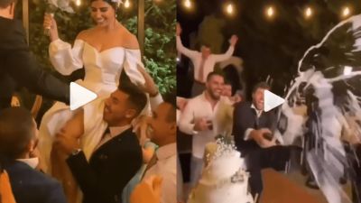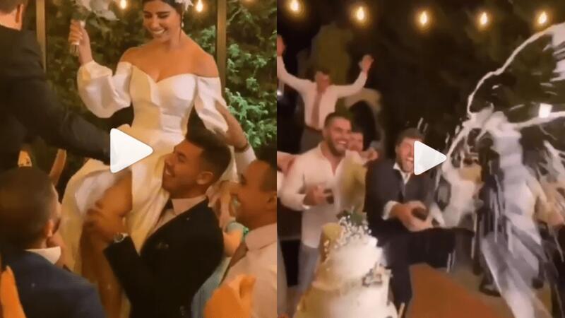 كما تم تداول فيديو للثنائي لحظة تقطيع قالب الحلوى، وبدت حركاتهما غير متزنة أثناء إمساكهما للسيف الخاص بالتقطيع، وفي فيديو آخر تم حمل الثنائي على الأكتاف وسبب وقتها الفستان المكشوف من المنطقة السفلى مشكلة للعروس. الحفل حضره عدد من المشاهير الذين قدموا سلسلة أغاني اختفالًا بالثنائي ومن بينهم جوزيف عطية، جو أشقر، جاد شويري.