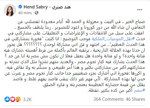 وأضافت: (سيل من الانتقادات و الإعتراضات و التعليقات على مشاركتي في حدث #نقل_الموميات_الملكية فوجب التوضيح : انا كتبت "فخورة بمشاركتي في هذا الحدث العظيم".. من اجتهد و قرّر اني مشاركة لوحدي ؟؟؟؟؟؟؟؟ هل يجوز ان حدثا بهذه الجلالة التاريخية ، يرتقبه العالم بأكمله من فرط أهميته ،تشارك فيه فنانة واحدة؟ و لو فنانة واحدة هل يعقل فعلا ان تكون مش مصرية ابا عن جد ؟ هذا الحدث يشارك فيه كبار نجوم مصر ، والعديد منهم نشروا مثل الذي نشرته ،و مشاركتهم اكبر من مشاركتي بكثير و هذا أمر طبيعي و مسلّم به ولا نقاش فيه).