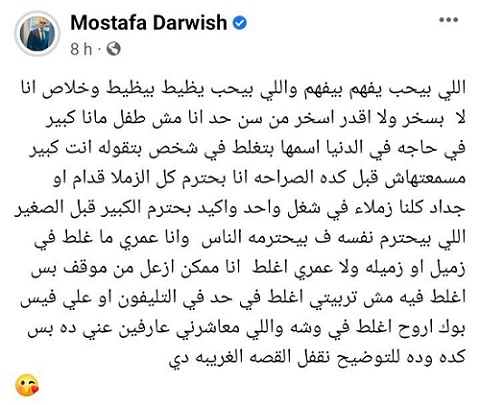 من جانبه رد الفنان مصطفى درويش عبر حسابه بموقع التواصل الاجتماعي (فيسبوك) بالتعليق علي ما قالته (معلش السن ربنا يديكي الصحة وفي فرق بينا أجيال كتير هتعرفي مين ولا مين)، ومع هجوم البعض عليه من رواد السوشيال ميديا اعتراضا على ما وصفوه بتنمر مصطفي درويش الذي عاد للرد مرة أخري لتوضيح وجهة نظره من خلال منشور آخر عبر حسابه بموقع التواصل الاجتماعي (فيسبوك) قال فيه (اللي بيحب يفهم بيفهم واللي بيحب يظيط بيظيط وخلاص أنا لا بسخر ولا أقدر أسخر من سن حد أنا مش طفل ما أنا كبير في حاجة في الدنيا اسمها بتغلط في شخص بتقوله انت كبير مسمعتهاش قبل كده الصراحة أنا بحترم كل الزملا قدام أو جداد كلنا زملاء في شغل واحد وأكيد بحترم الكبير قبل الصغير) مضيفا : (ممكن أزعل من موقف بس أغلط فيه مش تربيتي أغلط في حد في التليفون أو على فيسبوك أروح أغلط في وشه واللي معاشرني عارفين عني ده بس كده وده للتوضيح نقفل القصة الغريبة دي).