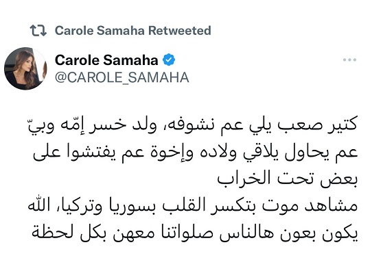 و على صعيد آخر، حرصت الفنانة على توجيه خالص الدعاء لضحايا الزلزال في سوريا وتركيا، وذلك عبر حسابها الرسمي بموقع (تويتر). وكتبت كارول سماحة في تغريدتها قائلة:(كتير صعب يلي عم نشوفه، ولد خسر إمّه وبيّ عم يحاول يلاقي ولاده وإخوة عم يفتشوا على بعض تحت الخراب).