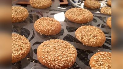 ثم اضغطها حتى تصبح رقيقة . غطي البرازق من جهة واحدة بالقطر والسمسم وضعيها في صينية فرن واخبزيها في فرن حرارته ١٨٠ لمدة ٨ دقائق.