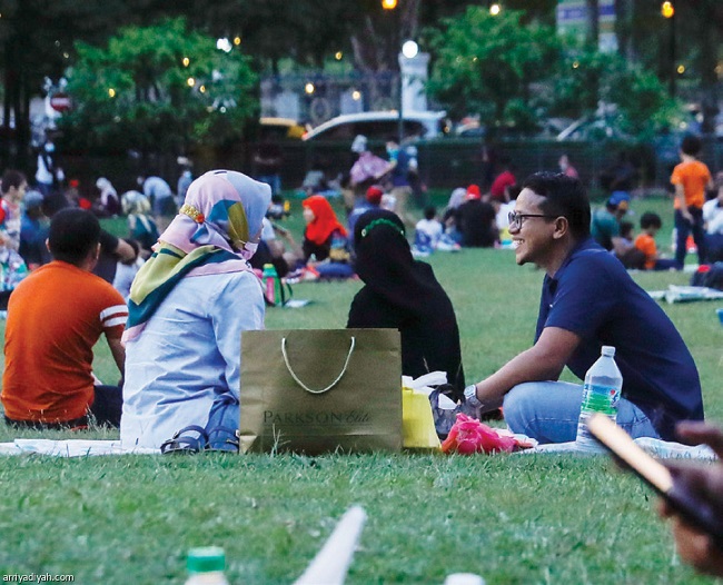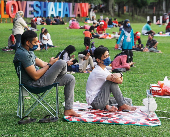 صور التقطت أمس لأسر ماليزية تجلس قبل موعد أذان المغرب على العشب في الحديقة العامة أمام جامع السلطان صلاح الدين في مدينة شاه علم بولاية سيلانجور(الأوروبية).