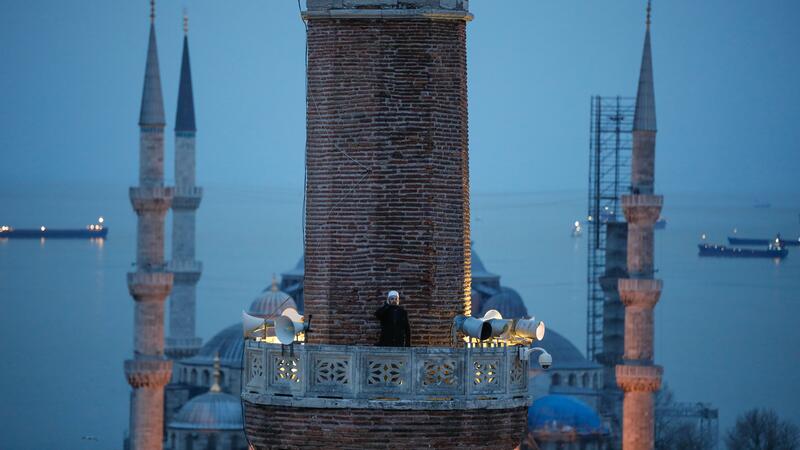 ووثقت عدسات المصورين اللحظة التي صعد مؤذن المسجد آيا صوفيا إلى إحدى مآذنه الأربعة، ورفع أذان إفطار اليوم الأول من شهر رمضان الكريم حيث تردد صداه في أرجاء المنطقة.