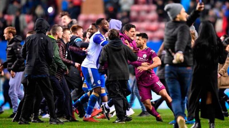 واندفعت جماهير ويغان الذي يتواجد في الدرجة الثانية لأرض الملعب احتفالاً بالانتصار على متصدر الدوري الإنجليزي الممتاز قبل أن تحدث بعض المشاحنات كان أولها اعتداء أجويرو على أحد المشجعين ثم تحطيم جمهور الضيف للافتات الملعب وإلقاءها على الجماهير المحتفلة.