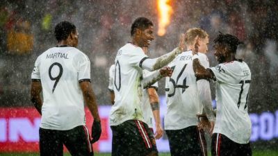 وسط أجواء مناخية صعبة وأمطار غزيرة، تقدم فريق الشياطين الحمر بهدفين نظيفين قبل نهاية الشوط الأول حملا توقيعي النجم جايدون سانشو (25)، وماتي كاش الذي سجل بالخطأ بمرمى فريقه في الدقيقة 42.