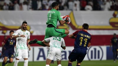 ياسر المسيليم حارس الأهلي السعودي يرتقي لإمساك كرة خلال مواجهة فريقه أمام الوحدة الإماراتي ضمن دوري أبطال آسيا والتي انتهت بالتعادل 1-1.