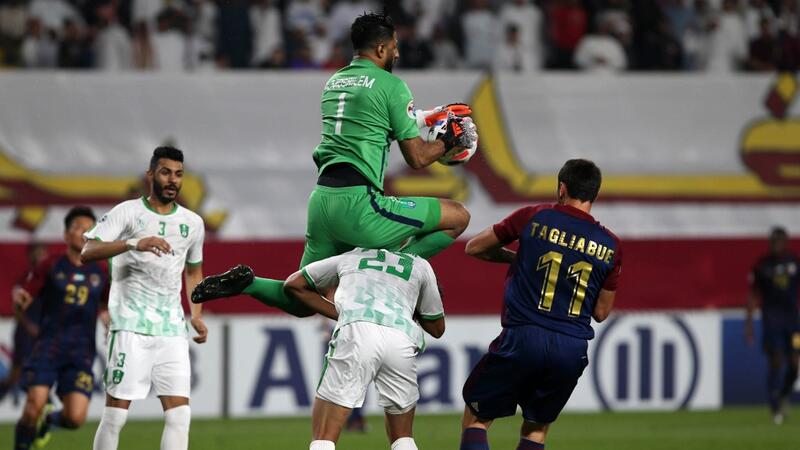 ياسر المسيليم حارس الأهلي السعودي يرتقي لإمساك كرة خلال المواجهة أمام الوحدة الإماراتي ضمن دوري أبطال آسيا والتي انتهت بالتعادل 1-1.