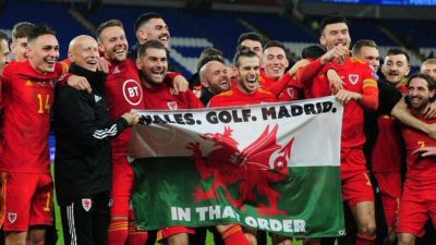 بايل وزملاؤه في منتخب ويلز يرفعون العلم وعليه كلمات: ويلز، الغولف، مدريد