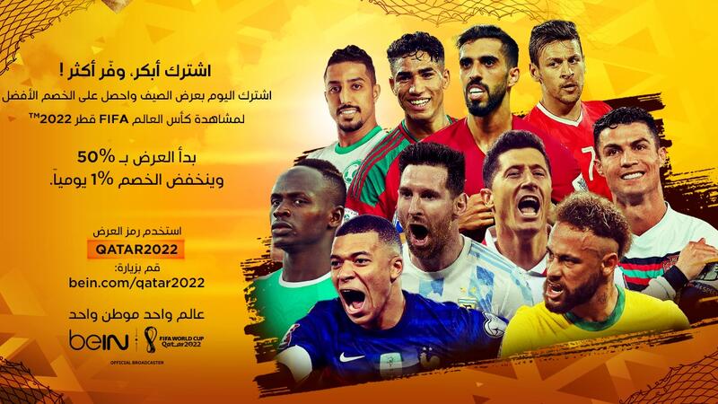 أطلقت beIN عرضاً جديداً مميزاً لهذا الصيف يبدأ بخصومات تصل الى 50%، سيُمنح من خلالها جميع مشتركي beIN الحاليين والجدد في جميع انحاء الشرق الأوسط وشمال أفريقيا إمكانية مشاهدة كافة مباريات كأس العالم FIFA قطر 2022 وفعاليات ما وراء الكواليس بالإضافة الى المحتويات الحصرية المميزة.
