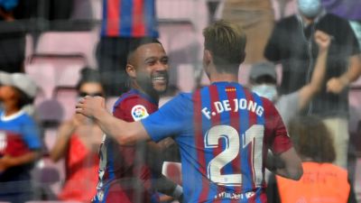الهولندي فرينكي دي يونغ (يمين) يهنىء مواطنه ديباي بهدفه