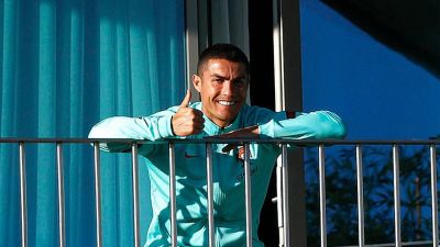 لكن رونالدو ابتسم للكاميرات، وأشار بإبهامه لأعلى وهو يشاهد زملائه، وهم يتدربون من شرفة غرفته في مجمع الفريق، بعد أن أكد الاتحاد البرتغالي لكرة القدم اختباره الإيجابي.
