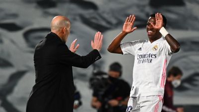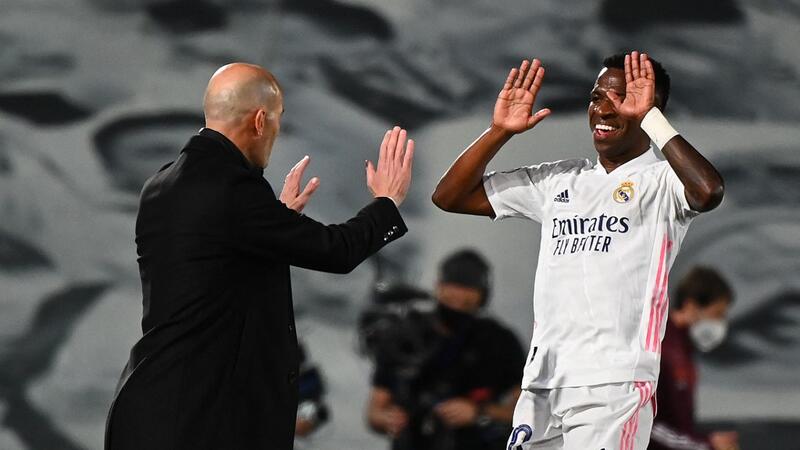 زيدان (يسار) يهنىء فينيسيوس نجم المباراة
