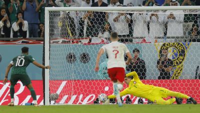 وتكفل سالم الدوسري بتنفيذ الركلة لكنه سددها أرضية سهلة أبعدها تشيزني قبل أن يمنع الحارس العملاق تسديدة محمد البريك في المتابعة لينتهي الشوط بتقدم منتخب بولندا 1-0.