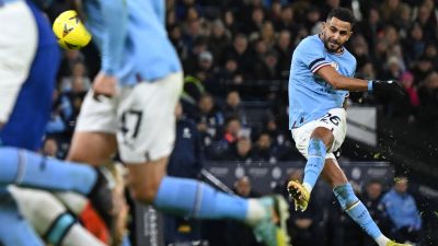 جاءت الأهداف عن طريق كلٍ من رياض محرز (هدفان) في الدقيقتين 23 و (85 من ركلة جزاء)، وجوليان ألفاريز (30 من ركلة جزاء)، وفيل فودين (38).