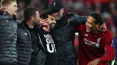 وعقب إطلاق صافرة النهاية توجه صلاح الذي كان يتابع اللقاء من مدرجات آنفيلد إلى أرض الملعب ليحتفل بالتأهل مع كلوب والمدافع فيرجيل فان دايك.