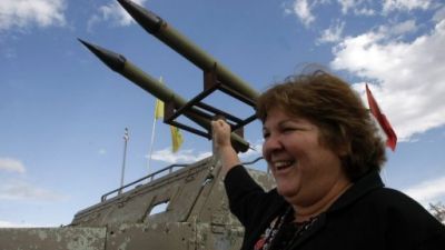 الييدا غيفارا تقف الى جانب نصب لدبابة وصواريخ شيده حزب الله خلال جولةو في قرية الخيام جنوب لبنان