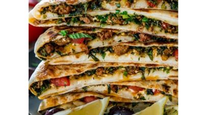 توضع حوالي 3 ملاعق كبيرة من خليط اللحم في منتصف المستطيل وتفرد قليلا. يضاف بعض النعناع الطازج، والبصل الأخضر والبقدونس الطازج، تضاف الجبنة والطماطم المفروم وتلف حواف العجين جيدا. يكرر مع قطع العجين المتبقية.