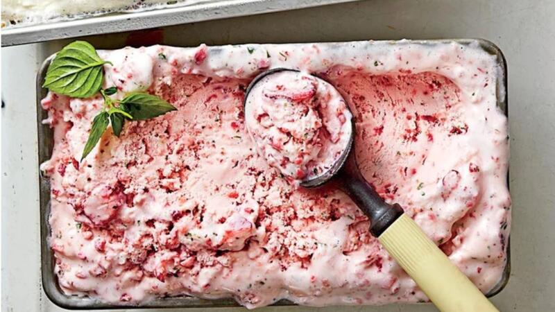 الفراولة الطازجة والريحان وصفة آيس كريم صيفية منعشة.