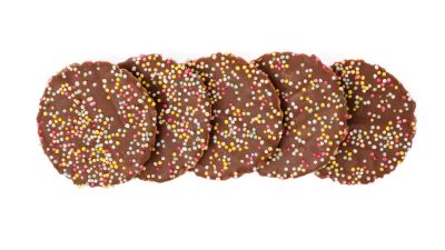 - بينما لا تزال الشوكولاته سائلة، رشي المكونات المفضلة لديك على كل منها. يمكنك استخدام نفس المكون على كل دائرة شوكولاتة أو تغييرها بحيث يكون لكل منها مجموعة نكهة مختلفة.