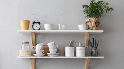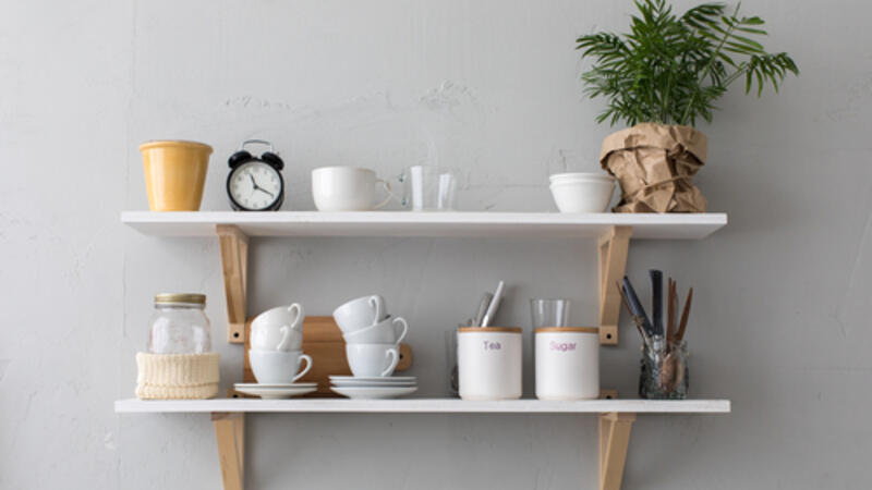 - تعلق الصواني بترتيب أنيق على الحائط. يمكن استغلال هذه الرفوف في ترتيب الفناجين الصغيرة عليها، أو مجموعة علب البهارات الصغيرة.