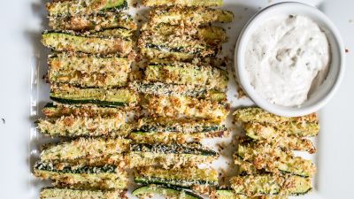 هذه الأصابع الشهية من الكوسا المغطاة بالثوم وزيت الزيتون ، مع رشة جبنة البارميزان.