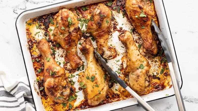 انقلي الدجاج إلى الفرن واخبزيه لمدة 40 دقيقة أو حتى تصل درجة حرارته الداخلية إلى 175 درجة فهرنهايت ، مع تقليب أفخاذ الدجاج مرة واحدة فقط. يقدم ساخنا.