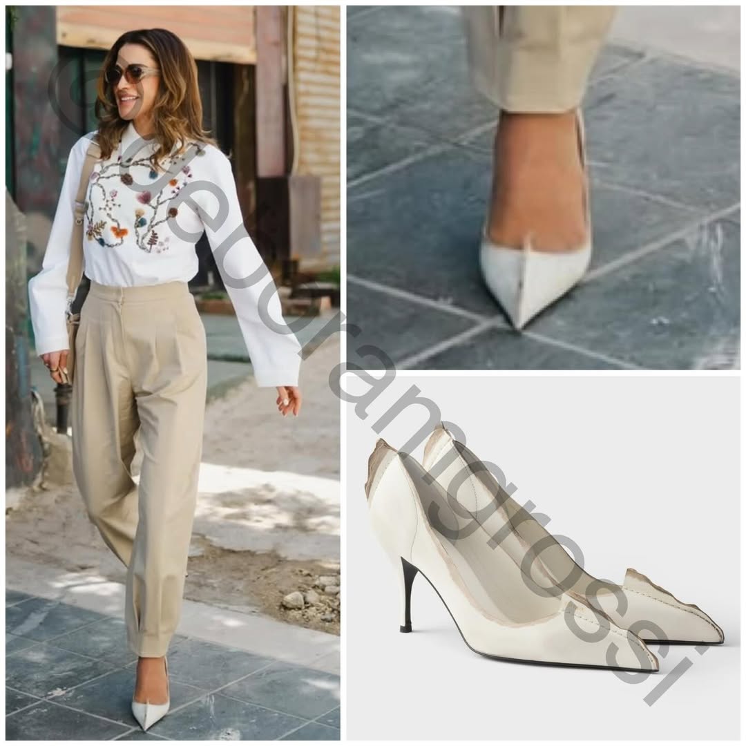 اختارت رانيا قميص باللون الأبيض كلاسيكي وجاء بتصميم أنيق، تميّز بتطريزات ناعمة وملونة أضفت لمسة فنية راقية دون أن تفقد الإطلالة بساطتها. ونسّقت معه بنطالًا واسعًا عالي الخصر باللون البيج من قماش القطن من ماركة ماكس مارا (MAX MARA) من طراز Kabuki، وهي من القصّات العصرية التي تجمع بين الراحة والأناقة وتبرز القوام بأسلوب أنثوي جذاب.