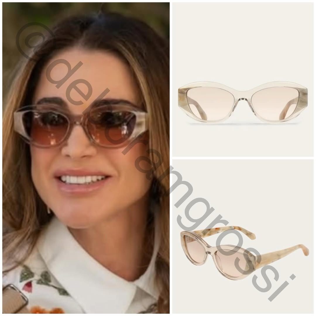 أما من حيث الإكسسوارات، فاعتمدت حذاء بسيط بكعب منخفض من ماركة برادا (PRADA) باللون الأبيض وبجلد بتأثير عتيق يناسب الإطلالات النهارية، وأكملت مظهرها بحقيبة كتف متناسقة وأنيقة من لاكوست (LACOSTE) من طراز Lenglen Bag، بينما زضعت نظارات شمسية أنيقة من فيراغامو (FERRAGAMO) بتصميم بيضاوي مميز، ما أضاف لمسة عصرية لافتة.