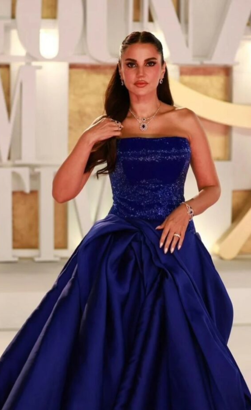 تألّقت مايان السيد بإطلالة مميزة وساحرة على السجادة الحمراء، حيث ارتدت فستان طويل باللون الذهبي وجاء لامعًا بقصة منسدلة تُبرز خصرها الرشيق. تميّز الفستان بتصميم عصري يمزج بين الكلاسيكية والبريق، فيما اكتمل جمال إطلالتها بمكياج ترابي ولمسة من الهايلايتر الذهبي الذي منح وجهها وهجًا متناغمًا مع لون الفستان. كما اختارت مايان تسريحة الشعر المموج الطبيعي، ما أضفى على ملامحها الشبابية أناقة هادئة وجاذبية لافتة.
