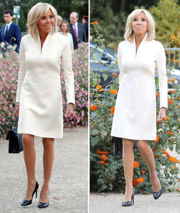 بريجيت ماكرون اختارت ثوباً أبيض مستقيم القصّة من دار لوي فويتون، قصير فوق الركبة، يتميّز بديكولتيه ناعم وبشياكة مذهلة، وقد تركت شعرها الأشقر منسدلاً هذه المرّة مع قصّة مربعة الشكل.