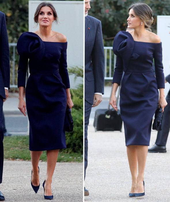 أمّا ليتيزيا ملكة اسبانيا فقد ارتدت ثوب كوكتيل خوخي اللون، طويل يتخطّى الركبة وبكتف واحد، كانت قد ارتدته سابقاً، وهو من توقيع ماركة J DELPOZO وهي الماركة الأحبّ إلى قلب ميلانيا ترامب.