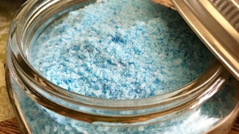 يضاف ملح البحر والإبسوم، وصودا الخبز إلى وعاء كبير. وتخلط جيدا.