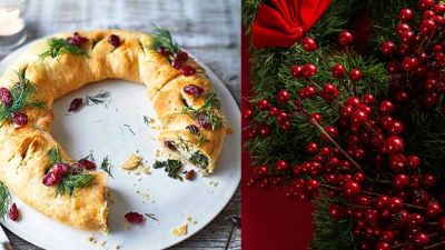 قدمي اكليلاً من المعجنات الدافئة المحشو بالسبانخ والجبن والصنوبر في يوم عيد الميلاد . زينيه بالتوت البري والشبت.