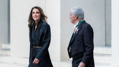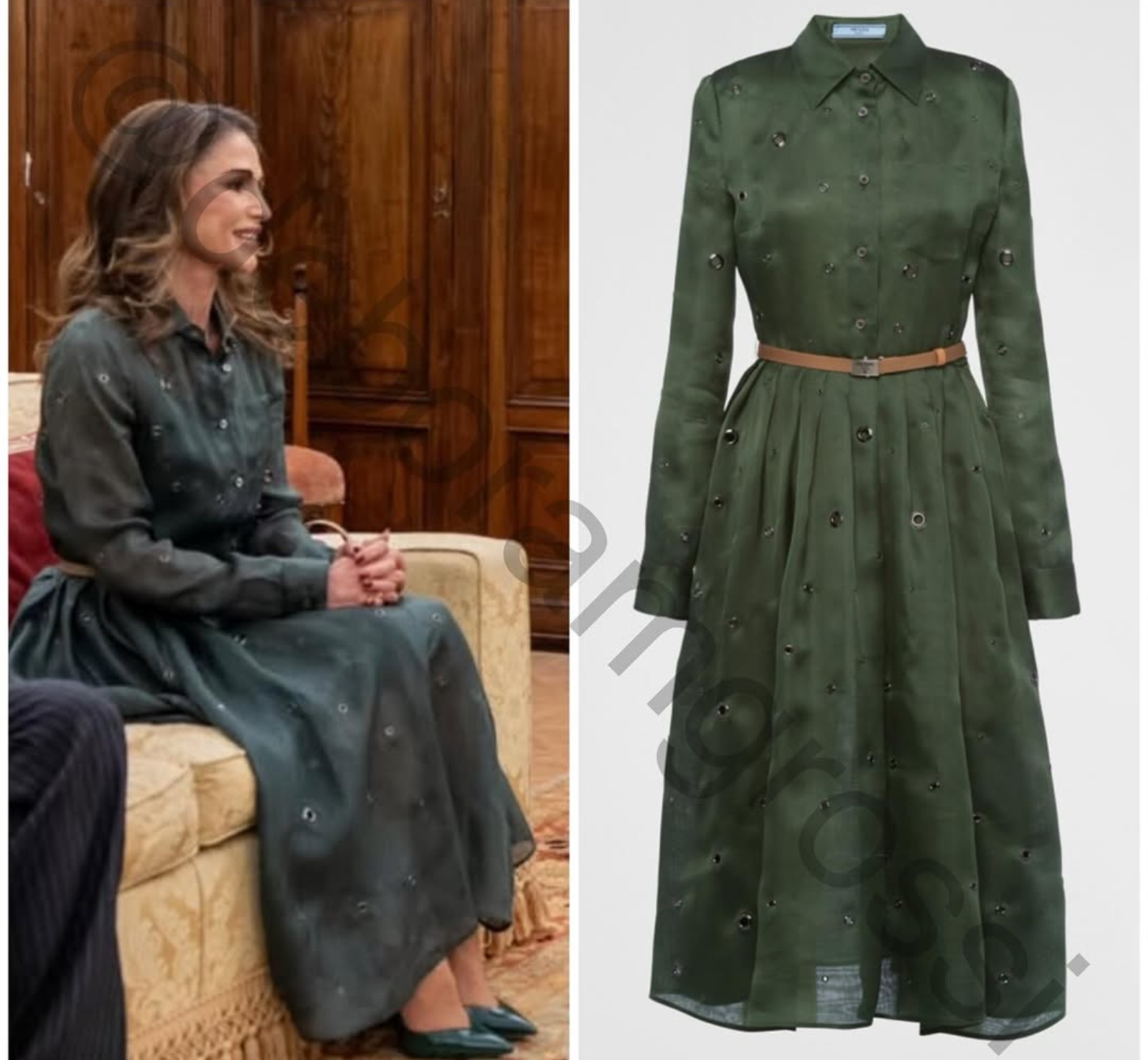تألقت رانيا العبدلله بفستان طويل من دار الأزياء الإيطالية "برادا" Prada باللون الأخضر الزيتوني الغامق، بتصميم أنثوي راقٍ بأزرار أمامية وتطريزات ناعمة تضفي لمسة من الفخامة الهادئة.