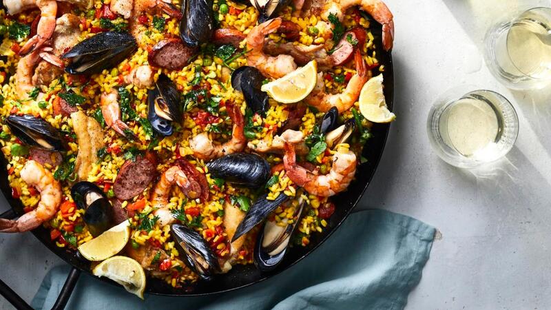 الباييا أو البايلا وصفة من أسبانيا تشتهر دول البحر المتوسط بالمأكولات البحرية مثل الروبيان والمحارات وبلح البحر.