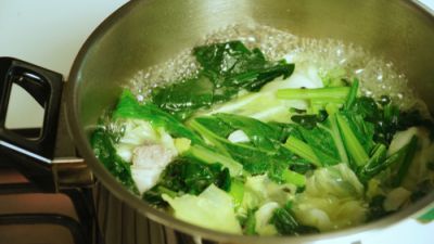 يُطحن الثوم ويقطَّع كلٌّ من الباذنجان والبصل والكراث والملفوف إلى دوائر، على أن يتمَّ الاحتفاظ ببعض عروق الكراث الخضراء. تُفرم الطماطم فرمًا ناعمًا، ويُقطَّع الفلفل الحلو إلى مكعبات. تُسلق الخضراوات في الماء حتَّى تنضج، ويُضاف زيت الزيتون وأعواد الهليون والبقدونس والبهار وورق الغار والملح.